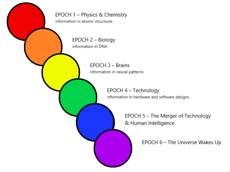 “Epoch 1 began with the Big Bang, and Epoch 2 began with abiogenesis, the beginning of life on Earth. Currently, we’re in Epoch 4. During Epoch 6, vastly expanded, predominantly non-biological human intelligence spreads through the universe, and patterns of matter and energy become saturated with intelligent processes and knowledge.” [19]