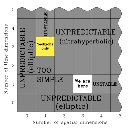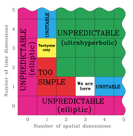 “There are two kinds of dimensions: spatial (bidirectional) and temporal (unidirectional). Let the number of spatial dimensions be S and the number of temporal dimensions be T. That S.=.3 and T.=.1, setting aside the compactified dimensions invoked by string theory and undetectable to date, can be explained by appealing to the physical consequences of letting S differ from 3 and T differ from 1.”