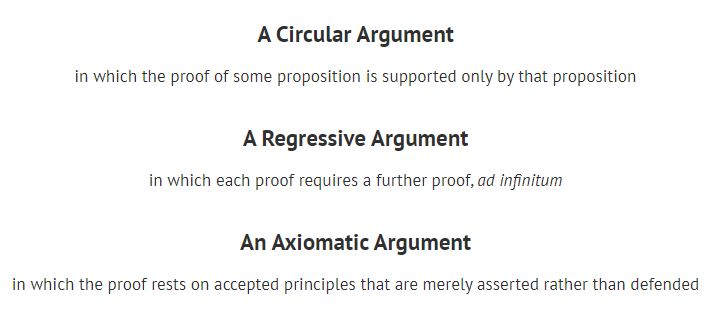 “If it’s asked how any knowledge is known to be true, proof may be provided. Yet that same question can be asked of the proof, and any subsequent proof. The Münchhausen trilemma is that there are only three options in this situation: